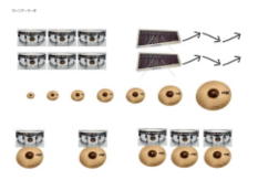 | 手書きの楽譜。いろんな楽器が指定されています。 | 「レストランごっこ」のメニューです。 | リズムを視覚的に把握します。左からモー、ワン、チュチュです。 |